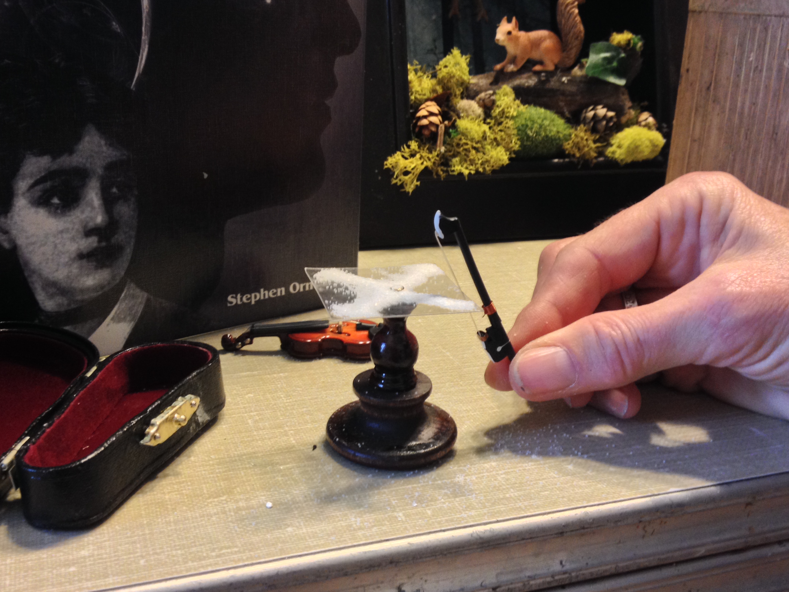 Chladni found that by drawing a violin bow along a metal or glass plate covered with sand, that various regular patterns would emerge. There is a fine replica of Chladni’s device at the Smithsonian Museum. Ours is 1:12 scale, and uses a teeny tiny violin bow.