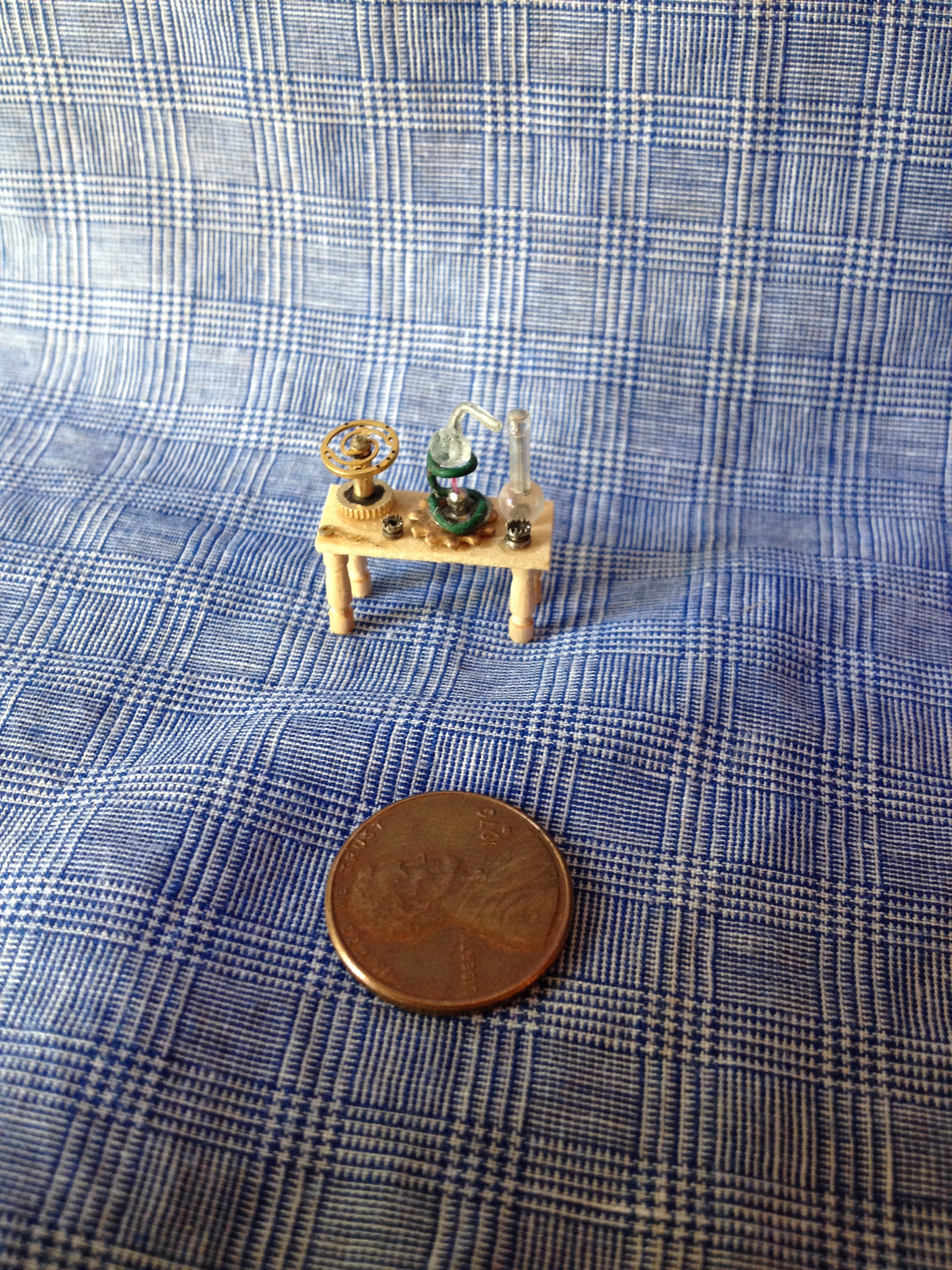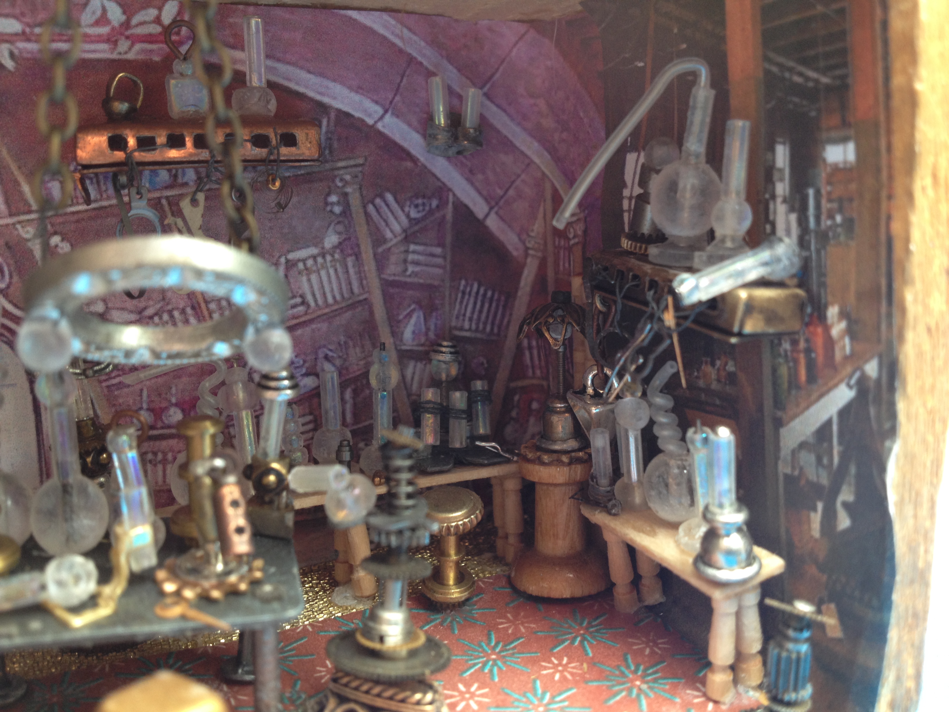 It is filled with lab equipment made from watch parts and beads and bits from the bead store.
